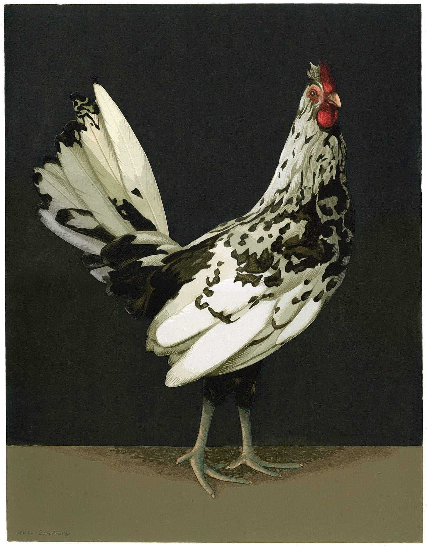 She says that chickens are smart and soulful, and she regrets that people make fun of them. Philip Levy, the author of Yard Birds: The Lives and Times of America’s Urban Chickens, feels the same. He says, “One of my goals is to make people think twice before laughing at chickens.” Some immutable principles of humor work against this goal, however, because chickens are humor, in a sense, and even their long overuse to get a laugh will not discourage people from using them to get one. And in fairness to comedy, some chickens were bred for it. One of Danovich’s chickens is a Salmon Faverolle, a breed with “a large, fluffy white beard that would impress any mall Santa.... People often refer to [this] breed as ‘barnyard comedians.’” Another backyard chicken keeper, Gina G. Warren, says in her book Hatched: Dispatches from the Backyard Chicken Movement that Silkies, a popular breed, are too small for eating, have head feathers like “spherical halos,” “are unreliable egg producers,” “run like drunk dinosaurs and are infinitely more hilarious than useful.”