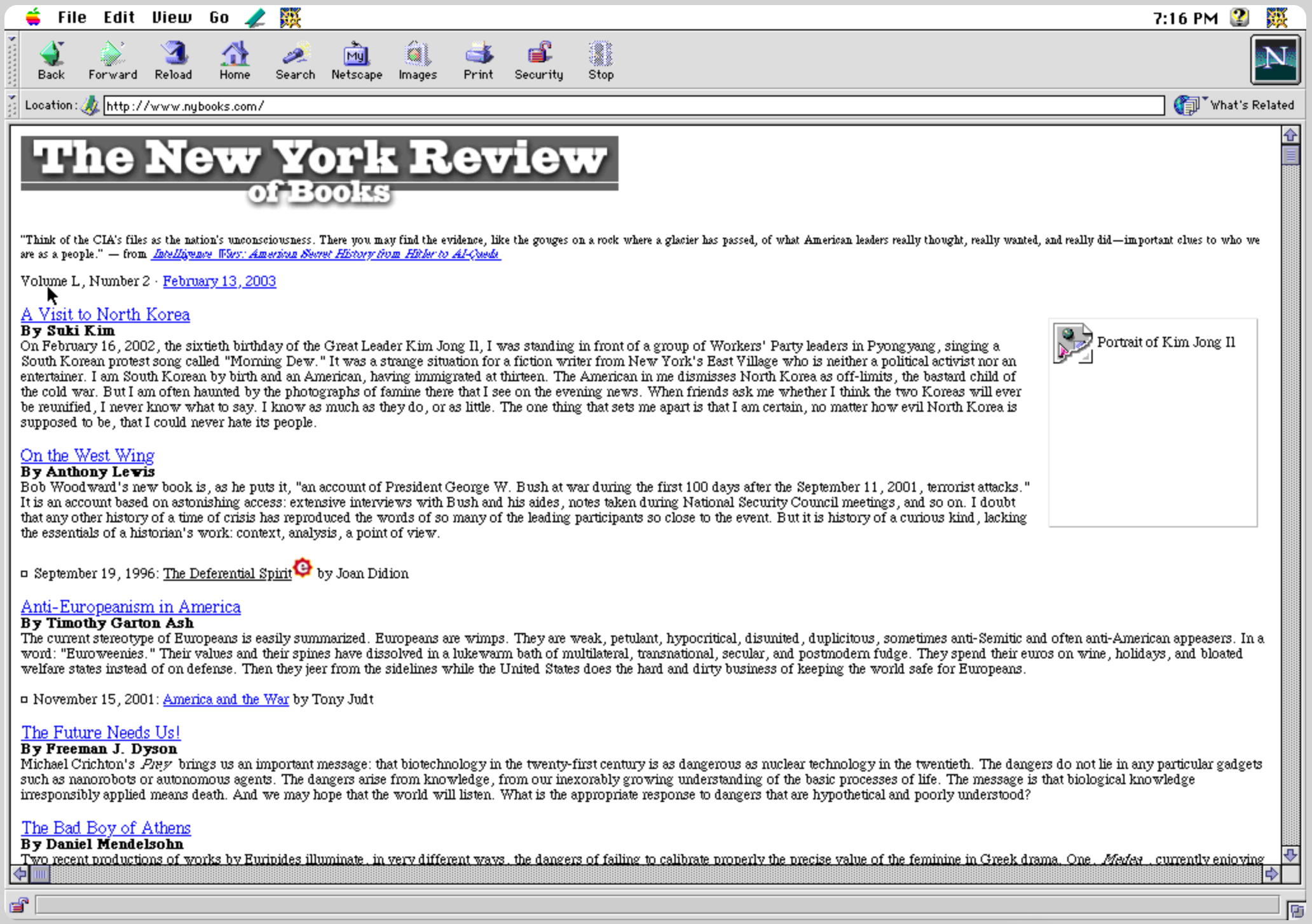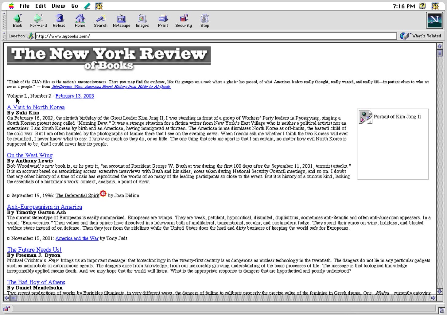 “‘The Web,’” James Fallows explained to readers of The New York Review of Books in February 1996, “is shorthand for the World Wide Web, a system allowing users to move from one Internet site to another.” But, he went on, “many people and companies experiment with the Web more because it’s a novelty than for immediate practical benefit…. Web-based shopping experiments have generally proven disastrous, since people find it easier and more satisfying to call a 1-800 number if they don’t want to go to the store.”