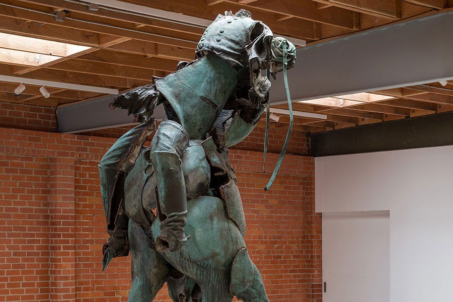 More than eleven feet tall, this uncanny sculpture is as much a work of inventive deformation as it is a feat of creativity. Unmanned Drone began life as a bronze equestrian monument to the Confederate general Stonewall Jackson that commanded a public plaza in Charlottesville, Virginia, for a century until it was decommissioned in 2021. One of the countless Confederate monuments that sprang up around the South during the era of Jim Crow, its ceremonious unveiling featured a parade of five thousand people, including Confederate veterans as well as a troupe of public school students who formed a “living” Confederate flag. The monument showed Jackson riding determinedly into battle, and it was created by the noted sculptor Charles Keck, an artist with a knack for producing heroic figures that retained an air of naturalism. An article published in The New York Times before its installation in 1921 predicted that “it will rank as the best figure of that celebrated warrior in the country.” That celebrated warrior has now been transformed into an aberrant chimera.